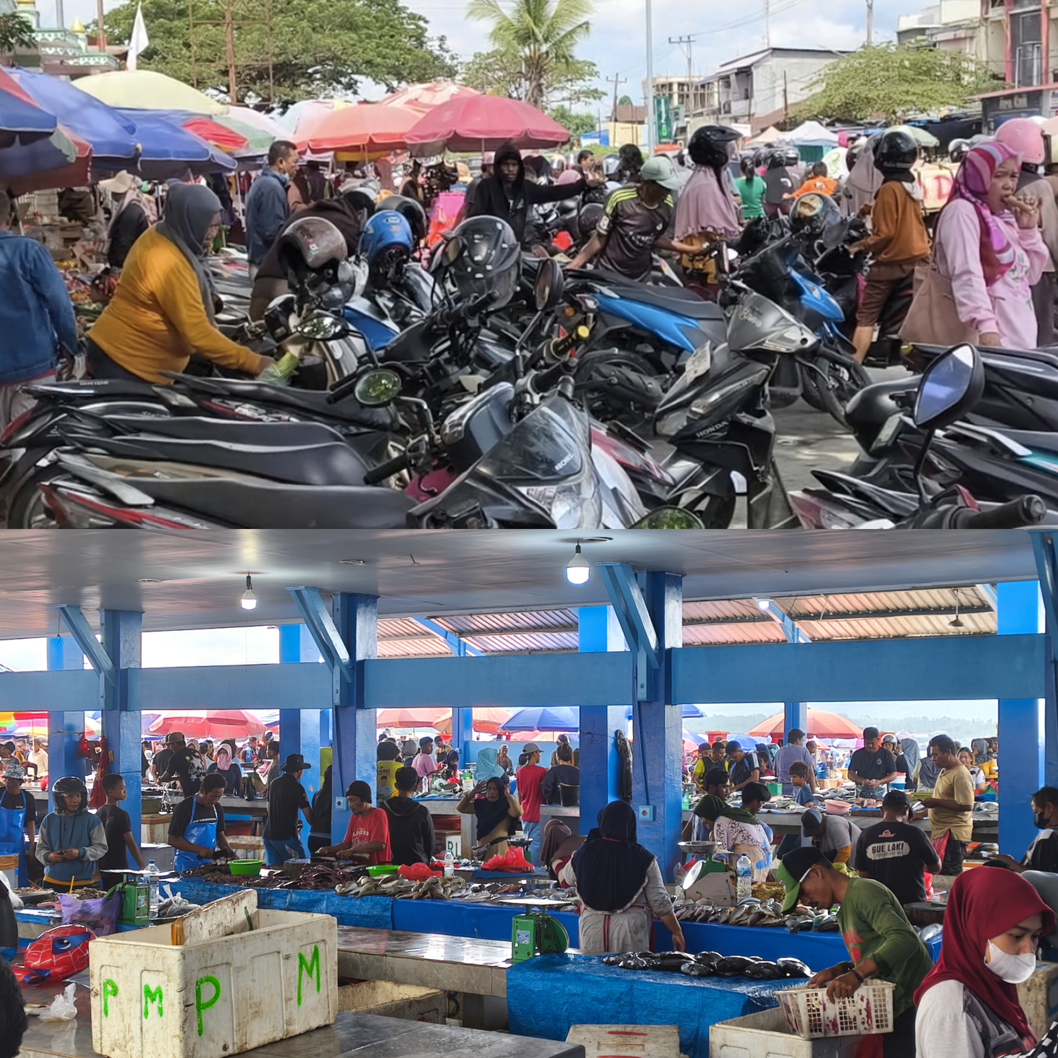 Kepadatan terlihat bukan hanya di area transaksi, tetapi juga di jalan menuju pasar. Sejumlah kendaraan roda dua dan empat tampak mengantre panjang untuk masuk ke lokasi.